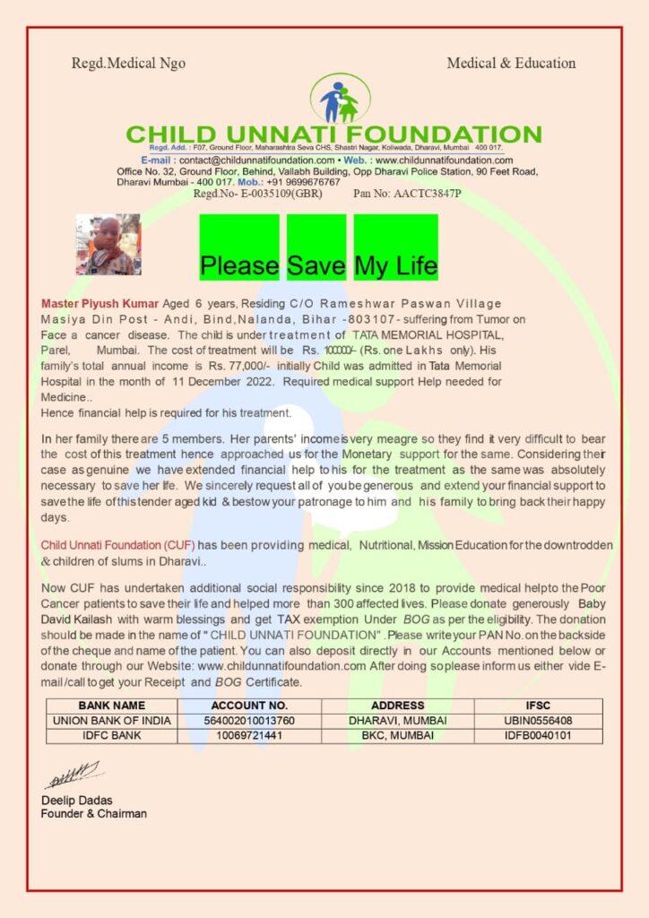 Total Cost :- 1,00,000Needs to Undergo: Tumour