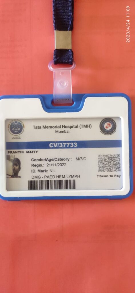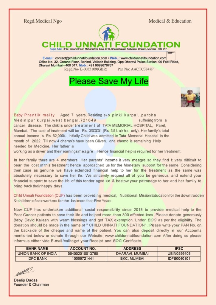 Name:- Prantik maity Age / Sex :- 7 year Total Cost :- 3.5Lacs Needs to Undergo: cancer treatment Hospital Name: Tata Memorial Hospital Permanat Adress : s/o pinki kurpai..purbha Medinipur kurpai,west bengal.721649 Current adress- Sant Gadge Maharaj Anath ashram, Dadar,Mumbai
